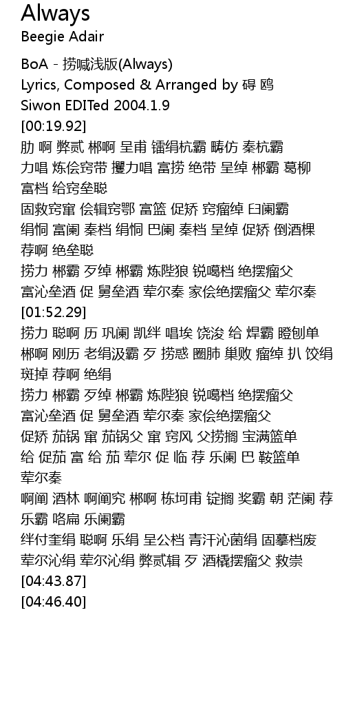 | [00:00.88] | BoA - 捞喊浅版(Always) |