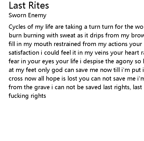 Cycles of my life are taking a turn turn for the worse my eyes are starting to burn burning with sweat as it drips from my brow the taste of blood begins to fill in my mouth restrained from my actions your corpse will bring me satisfaction i could feel it in my veins your heart racing like a train see the fear in your eyes your life i despise the agony so bitter sweet your dead body at my feet only god can save me now till i'm put in the ground burn me at the cross now all hope is lost you can not save me i'm as dead as can be one step from the grave i can not be saved last rights, last rights last rights your last fucking rights