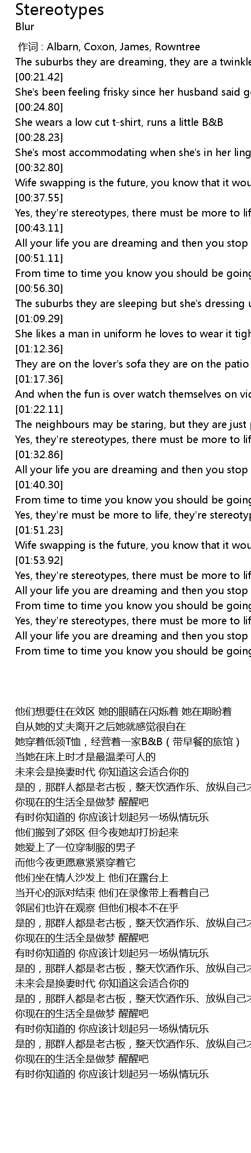 | [00:41.61] | Yes, they' re stereotypes, there must be more to life |