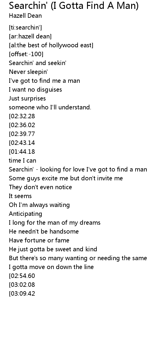 [01:51.52][02:54.60] Searchin' - looking for love I got to find me a man