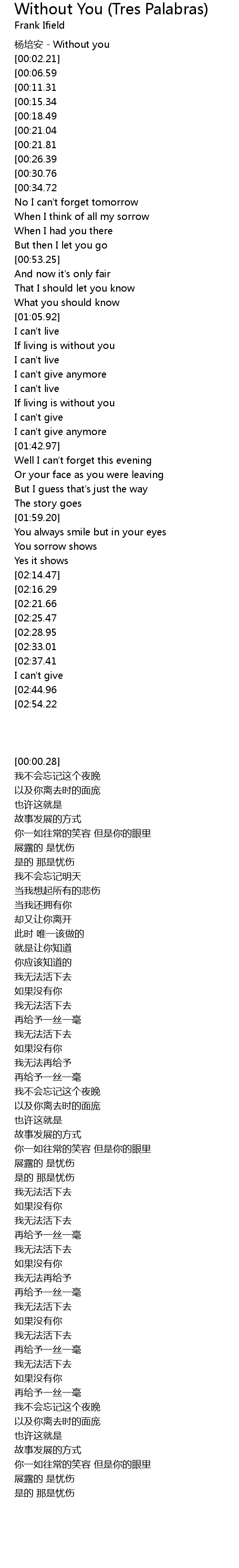 | [00:00.28] | 杨培安 - Without you |