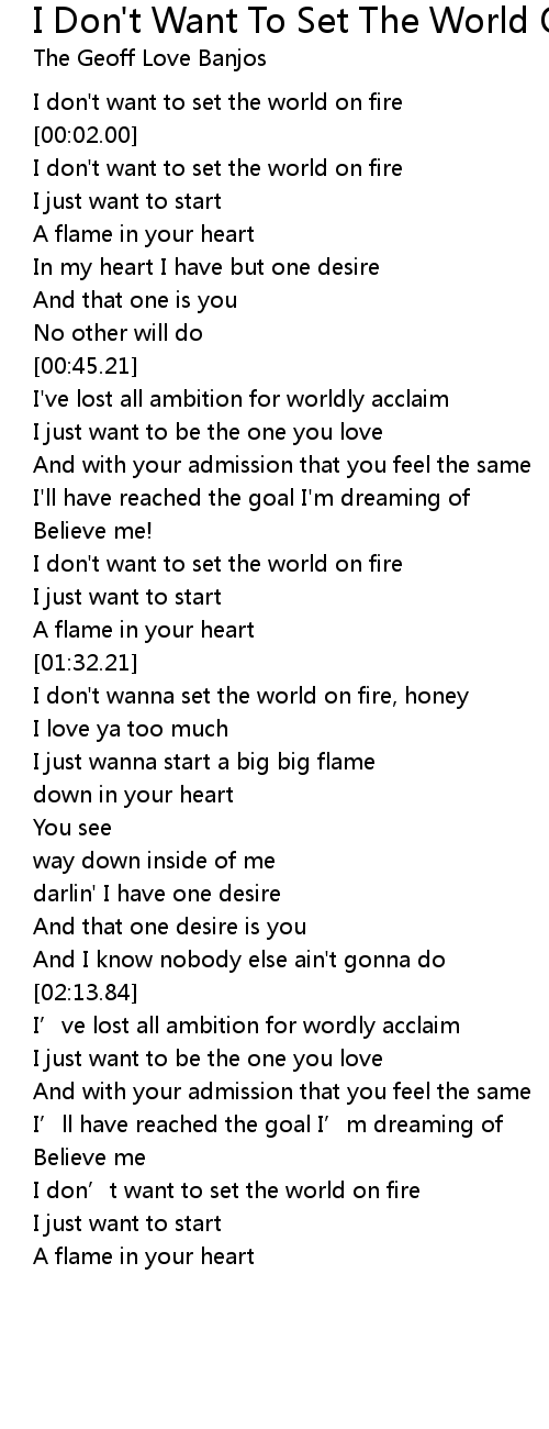 | [01:35.42] | I don' t wanna set the world on fire, honey |