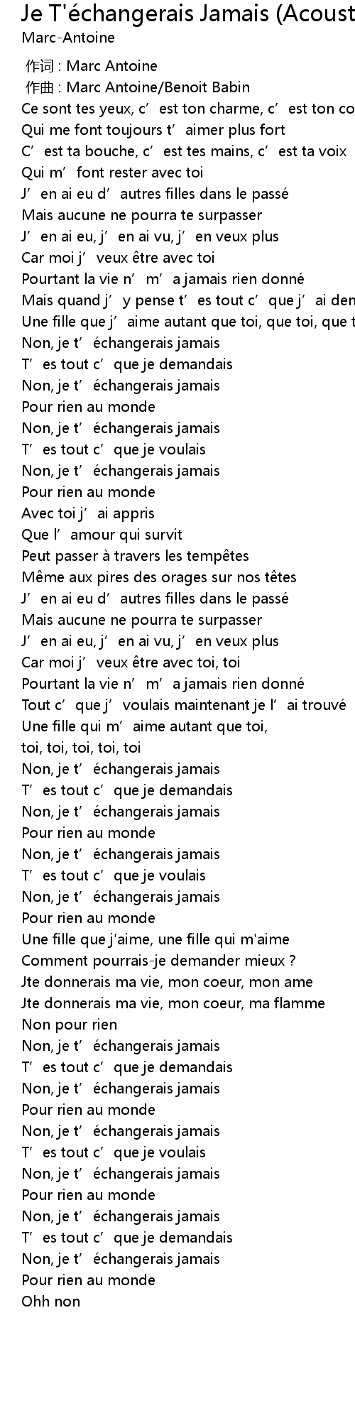| Song | Je T'échangerais Jamais (Acoustique) |