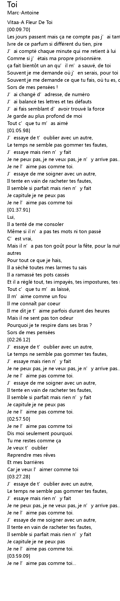 | [03:36.06] | Je ne peux pas, je ne veux pas, je n' y arrive pas |