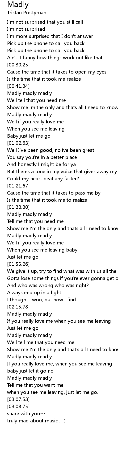 | [01:38.95] | Show me I'm the only and thats all I need to know. |