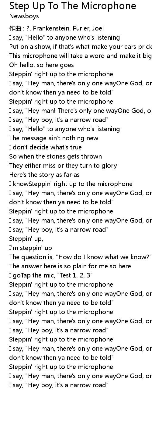 | I say, " Hey man, there' s only one wayOne God, one body, one faith aloneIf you don' t know then ya need to be told" | |
