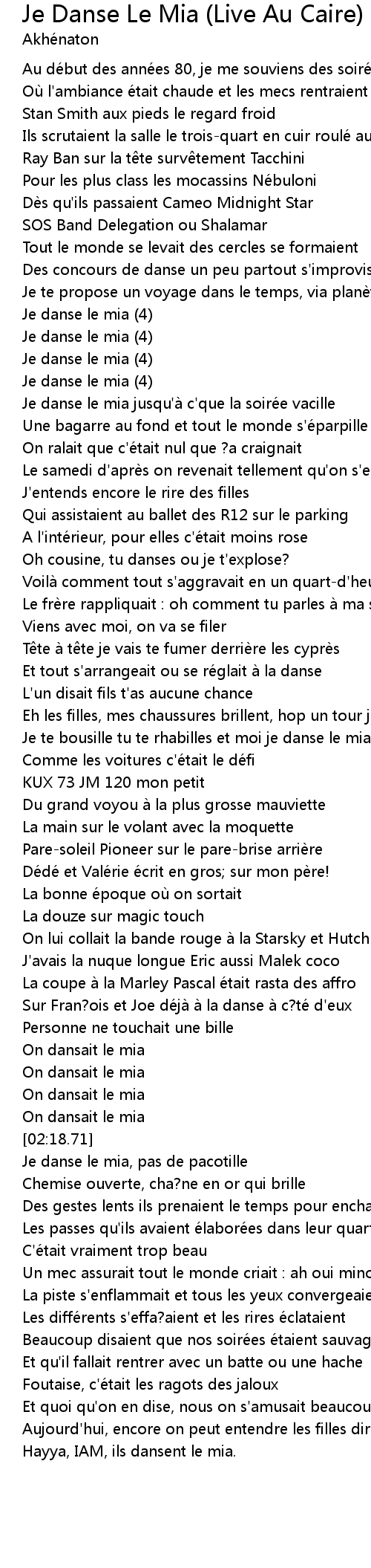 | [03:32.01] | Hayya, IAM, ils dansent le mia. |