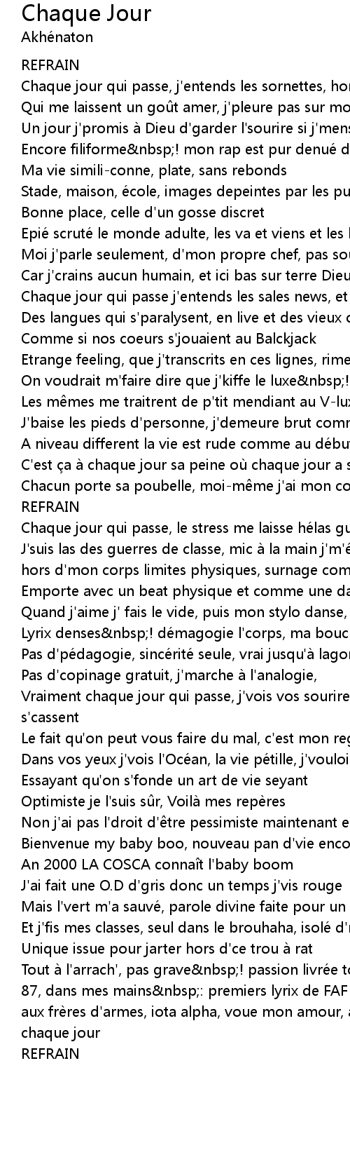 | Chaque jour qui passe, j'entends les sornettes, hors d'ta bouche qui m'lassent | |