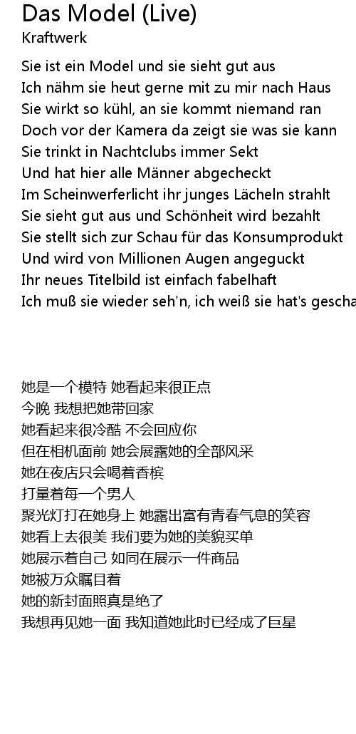 | [00:17.73] | Sie ist ein Model und sie sieht gut aus |