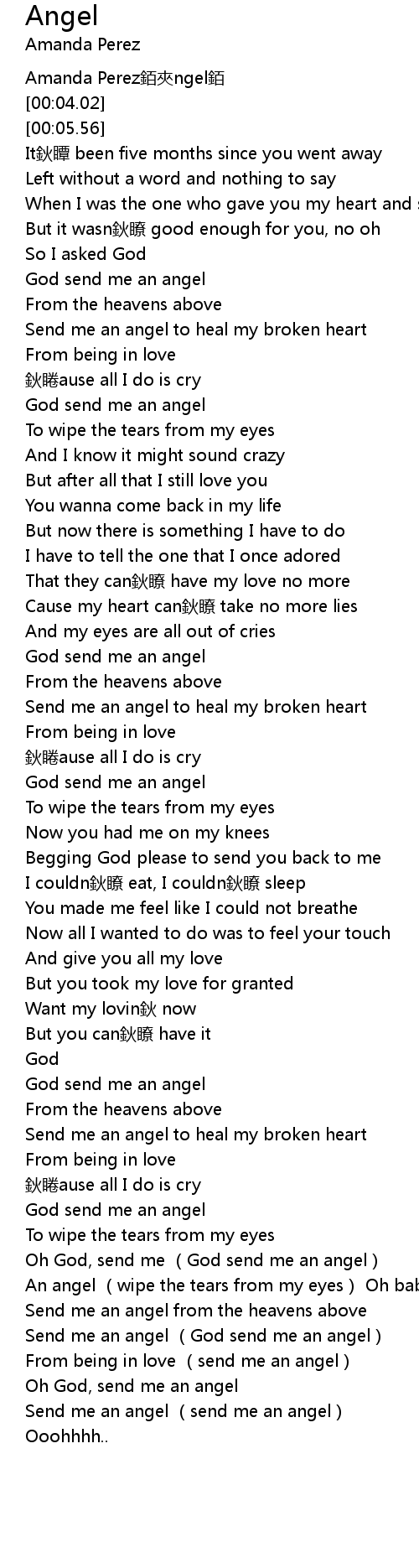 | [01:35.69] | Send me an angel to heal my broken heart |