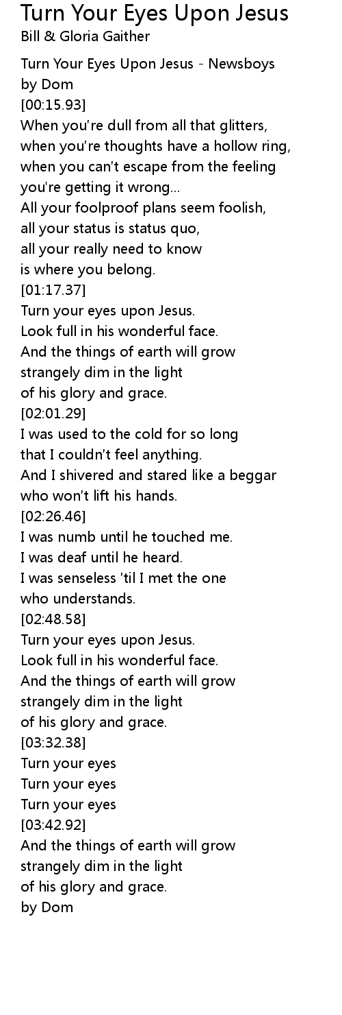 | [00:00.12] | Turn Your Eyes Upon Jesus Newsboys |