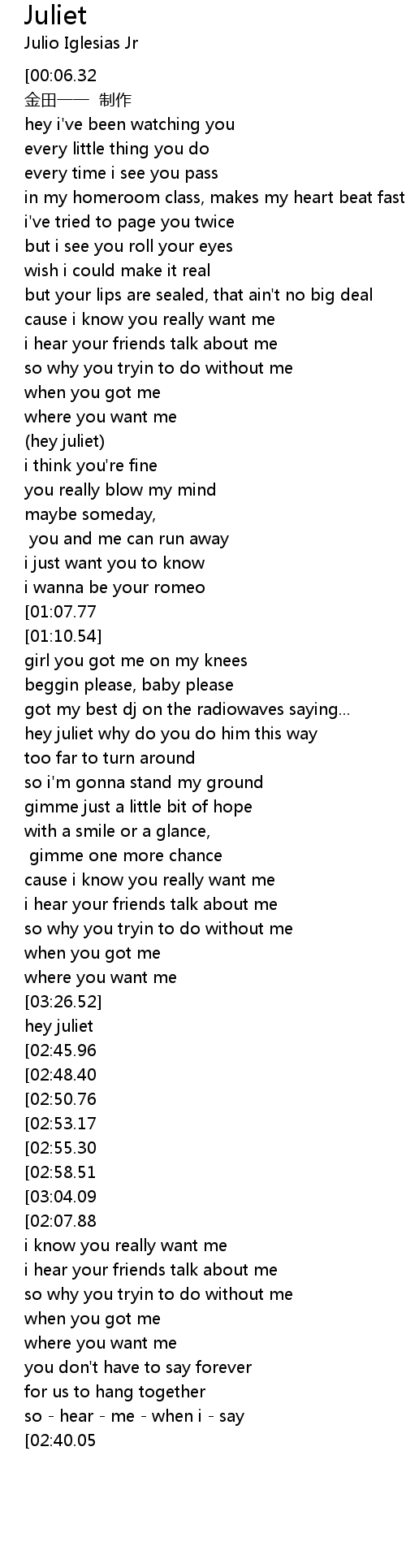 | [01:12.64][01:07.77][01:04.19] | hey juliet |