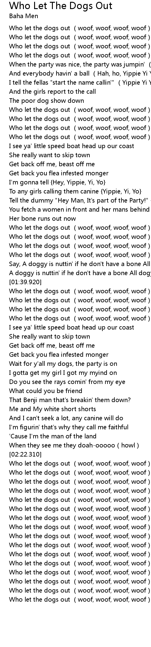 | [02:30.420] | Who let the dogs out woof, woof, woof, woof |