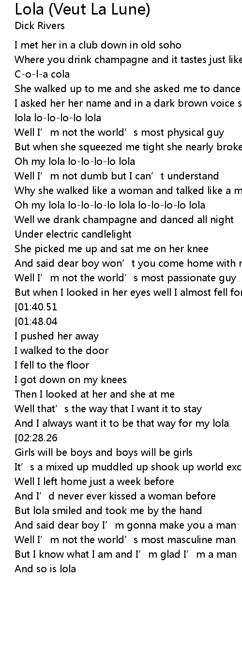 | [03:06.53][01:40.51] | Lo-lo-lo-lo lola lo-lo-lo-lo lola |