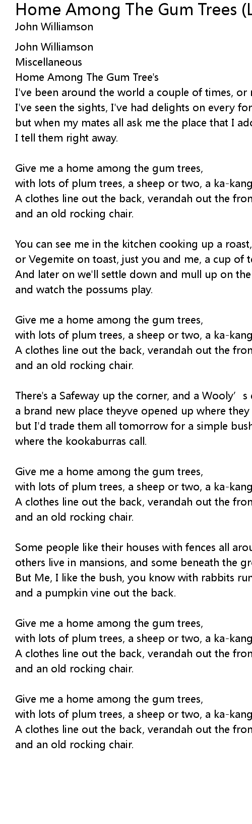 | Give me a home among the gum trees, | |