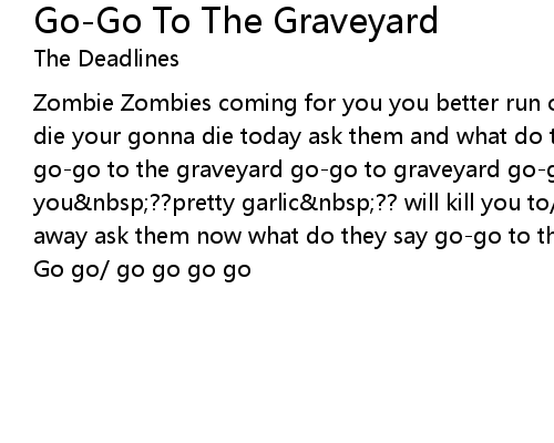 | Zombie Zombies coming for you you better run or they'll hit you too. Your gonna die your gonna die today ask them and what do they say go-go to the graveyard go-go to the graveyard go-go to graveyard go-go go go/ zombie zombies coming for you ??pretty garlic ?? will kill you to/ you better run better run away ask them now what do they say go-go to the graveyard..... | |