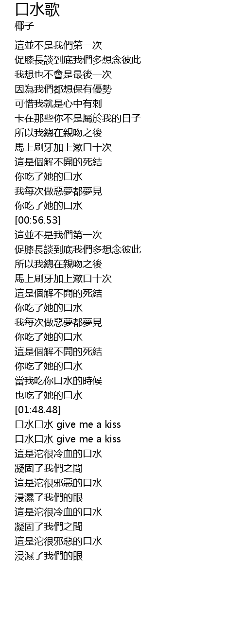 | [02:02.62] | 口水口水 give me a kiss |