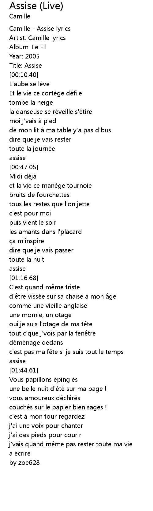 | [00:22.13] | Et le vie ce cortè ge dé file |