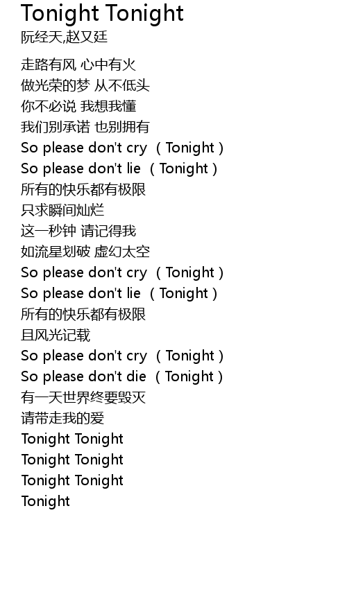 | [01:12.710] | So please don' t cry Tonight |