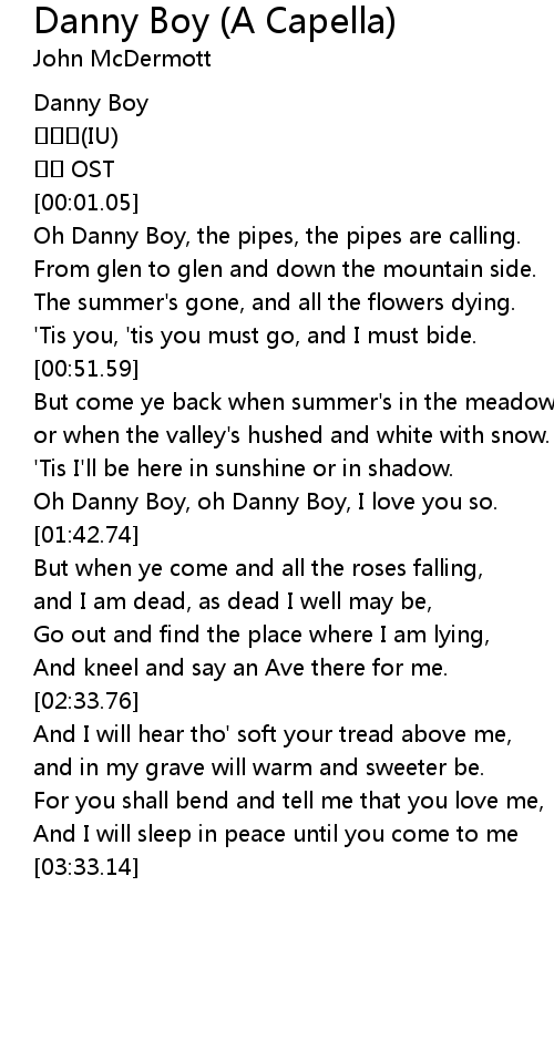 | [01:32.46] | Oh Danny Boy, oh Danny Boy, I love you so. |
