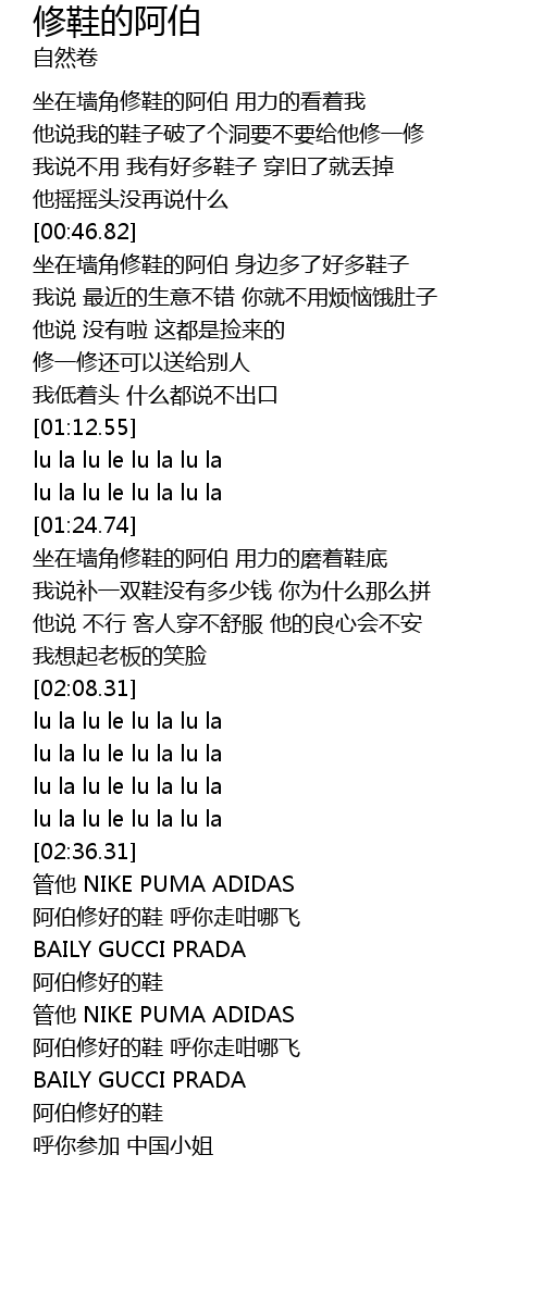 | [03:03.23] | 阿伯修好的鞋 呼你走咁哪飞 |