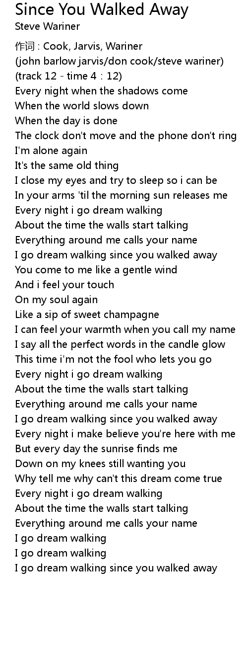 | I go dream walking since you walked away | |