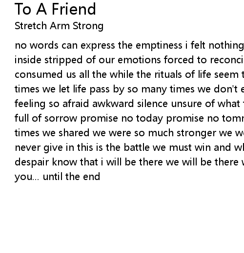 no words can express the emptiness i felt nothing can hide the way we felt inside stripped of our emotions forced to reconcile the suffering of a friend consumed us all the while the rituals of life seem to lose their shine so many times we let life pass by so many times we don't even try feelign so useless feeling so afraid awkward silence unsure of what to say drowning in an ocean full of sorrow promise no today promise no tommorrow look back and remember the times we shared we were so much stronger we were never scared never give up never give in this is the battle we must win and when you're in the depths of despair know that i will be there we will be there we'll comfort you we'll carry you... until the end |