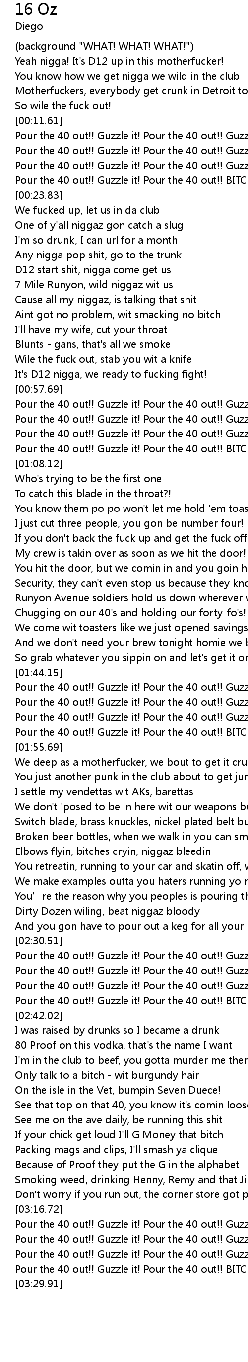 | [00:19.77] | Pour the 40 out!! Guzzle it! Pour the 40 out!! BITCH!!! |