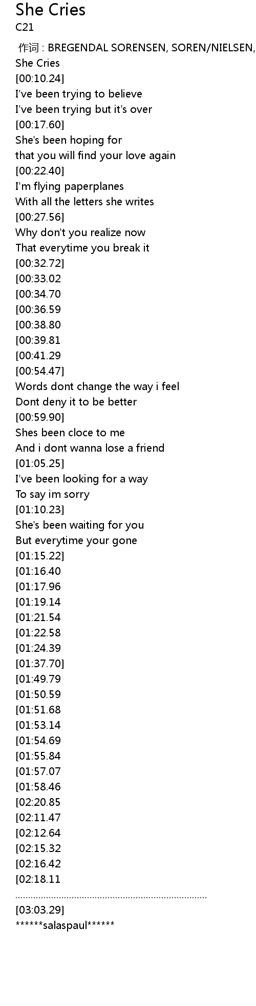 | [02:32.34][02:20.85][02:10.54] | She cries |