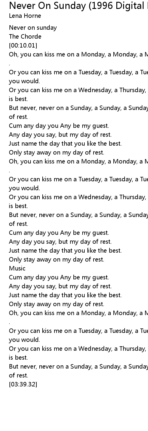 But never, never on a Sunday, a Sunday, a Sunday, cause that' s my day of rest. |