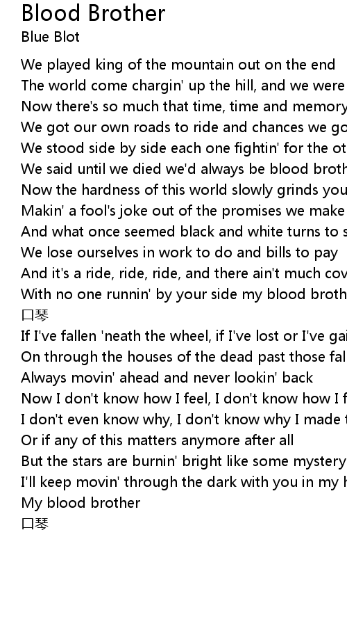 | [01:43.34] | With no one runnin' by your side my blood brother |