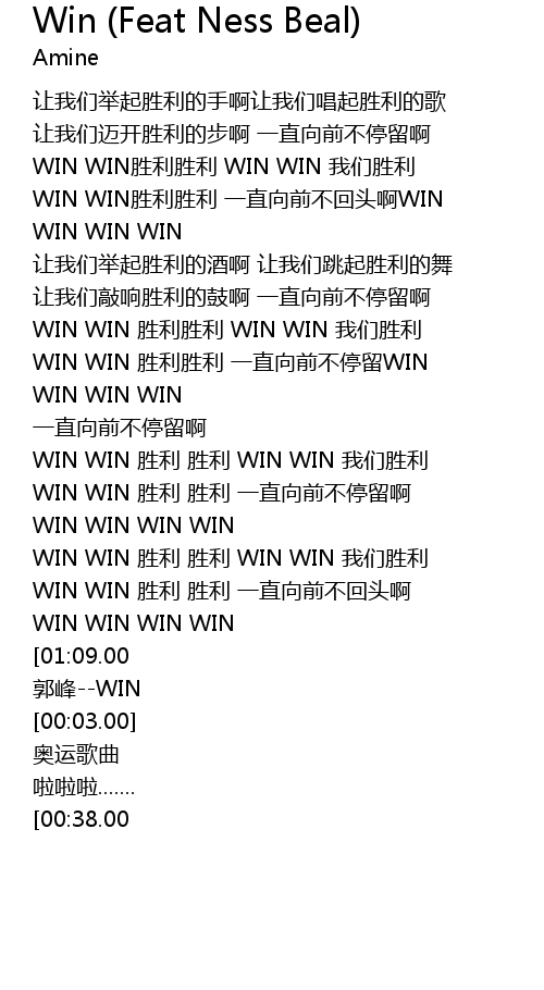 | [01:39.00] | WIN WIN 胜利胜利 WIN WIN 我们胜利 |