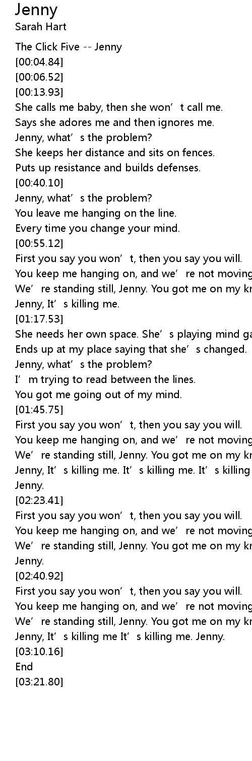 | [01:12.16] | Jenny, It' s killing me. |