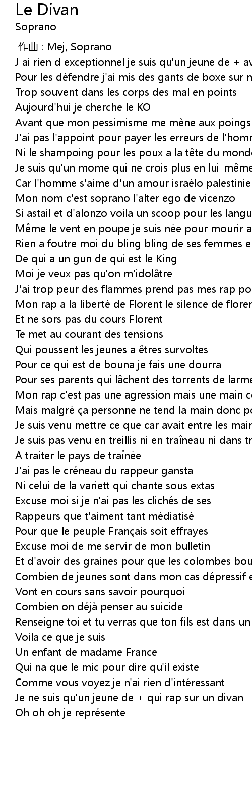 | [02:19.07] | Je ne suis qu' un jeune de qui rap sur un divan |