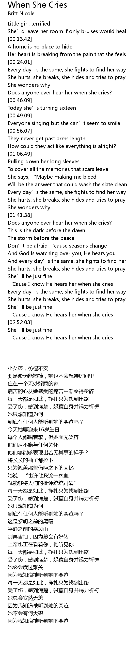 | [02:48.01] | ‘Cause I know He hears her when she cries |