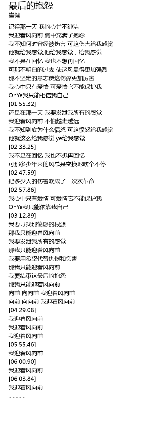 | [00:41.37] | 我迎着风向前 胸中充满了抱怨 |