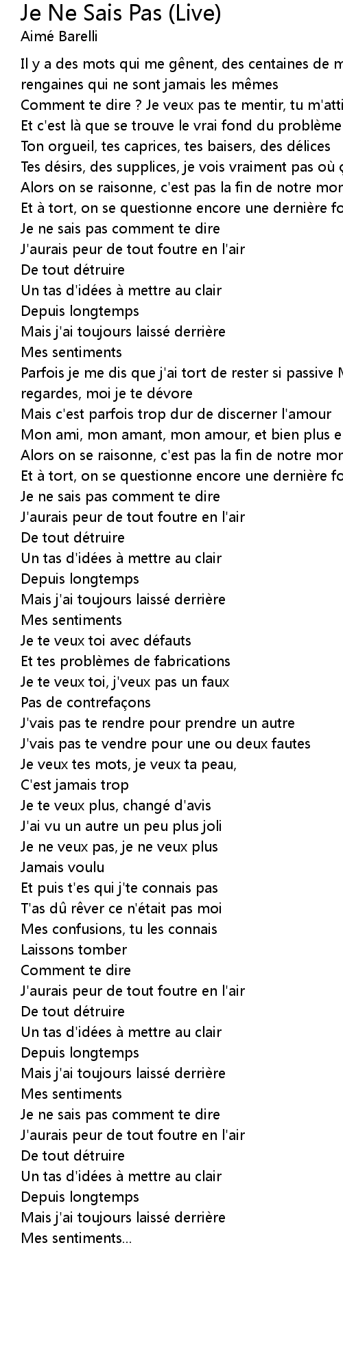 | [00:17.20] | Il y a des mots qui me gênent, des centaines de mots des milliers de rengaines qui ne sont jamais les mêmes |
