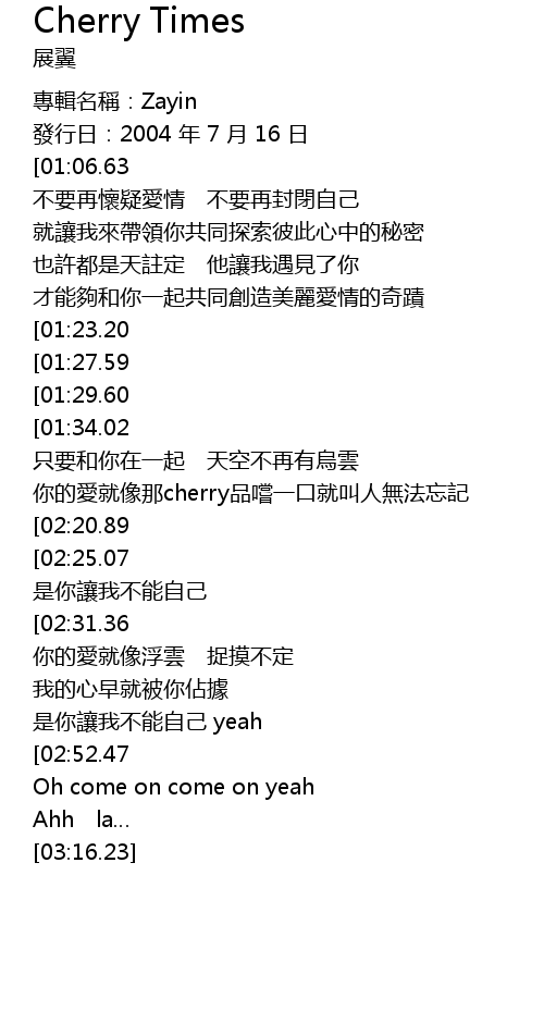 | [01:16.86] | 你的愛就像那cherry品嚐一口就叫人無法忘記 |