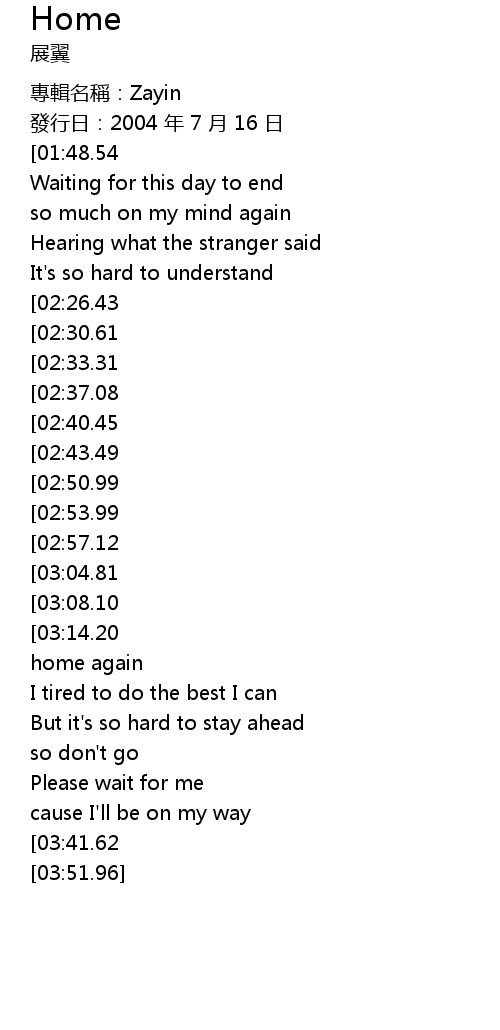 | [03:34.64][03:41.62][03:48.31] | home again |
