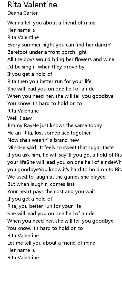 If you ask him, he will say"If you get a hold of Rita then you better run for your lifeShe will lead you on one hell of a rideWhen you need her, she will tell you goodbyeYou know it's hard to hold on to Rita Valentine" |