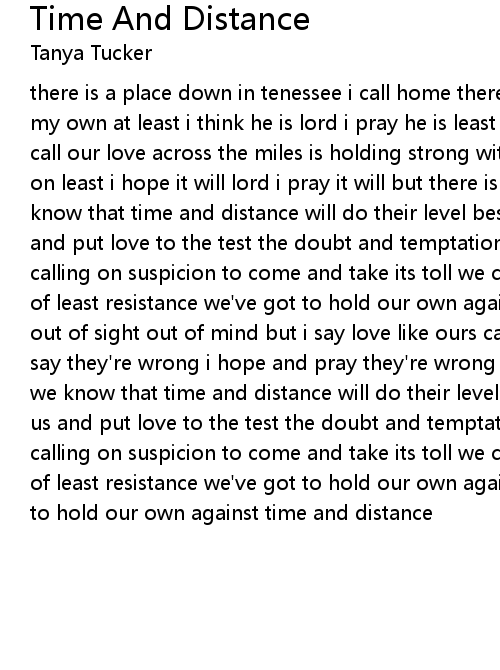 there is a place down in tenessee i call home there is someone down there i call my own at least i think he is lord i pray he is least i could do is give him a call our love across the miles is holding strong with every sign of going on and on least i hope it will lord i pray it will but there is a danger still cuz we know that time and distance will do their level best to build a wall between us and put love to the test the doubt and temptation step in and take control calling on suspicion to come and take its toll we cant lead love down the path of least resistance we've got to hold our own against time and distance they say out of sight out of mind but i say love like ours can hold the line im here to say they're wrong i hope and pray they're wrong and we can keep love strong cuz we know that time and distance will do their level best to build a wall between us and put love to the test the doubt and temptation step in and take control calling on suspicion to come and take its toll we cant lead love down the path of least resistance we've got to hold our own agains time and distance we've got to hold our own against time and distance |