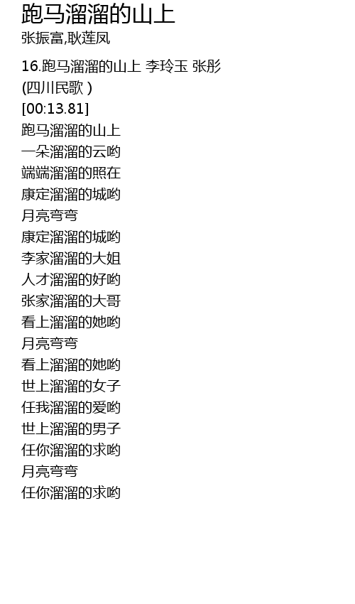 | [00:12.30] | 16.跑马溜溜的山上 李玲玉 张彤 |