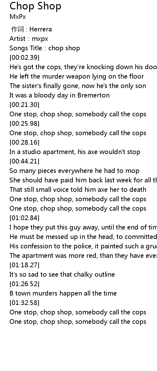 | [00:23.04] | One stop, chop shop, somebody call the cops |