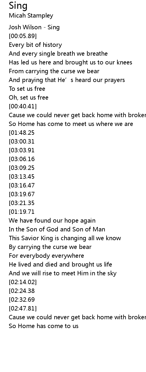 | [03:30.09][03:06.16][01:54.16][01:00.13] | Sing, He will never leave us |