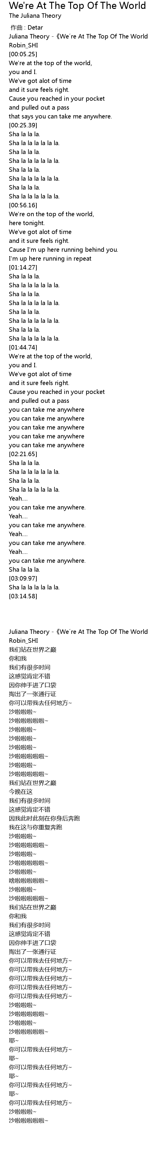 | [00:58.34] | We' re on the top of the world, |