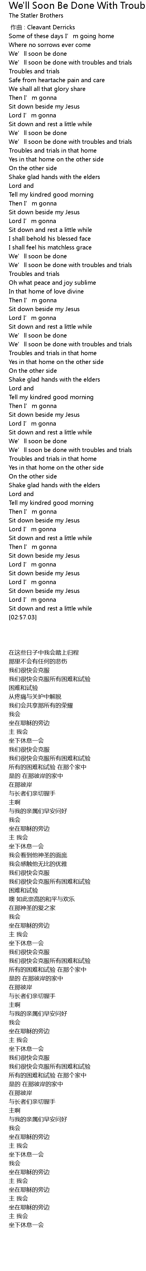 | [01:50.51] | We’ll soon be done with troubles and trials |