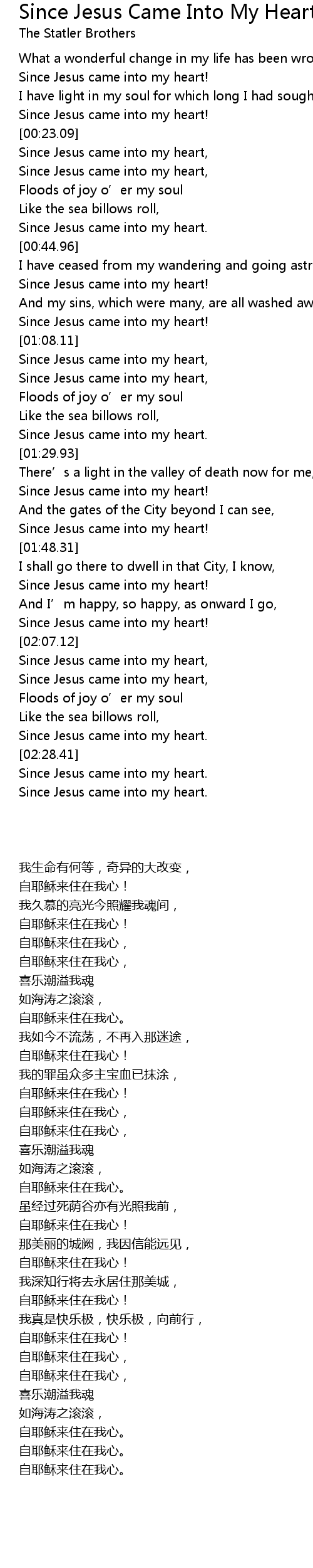 | [00:05.25] | What a wonderful change in my life has been wrought |