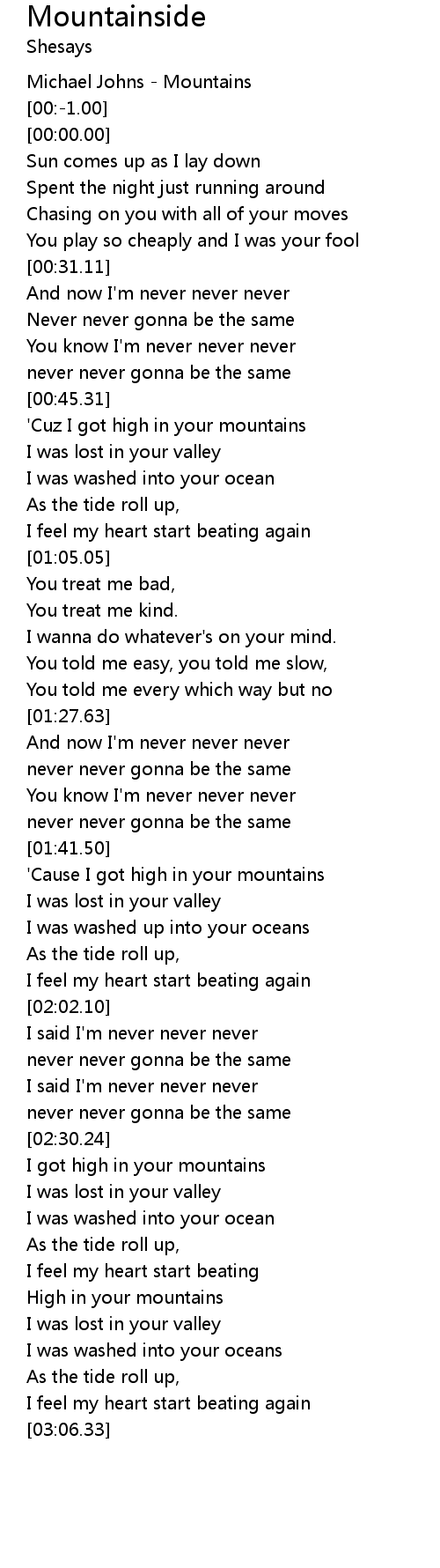 | [00:47.28] | 'Cuz I got high in your mountains |