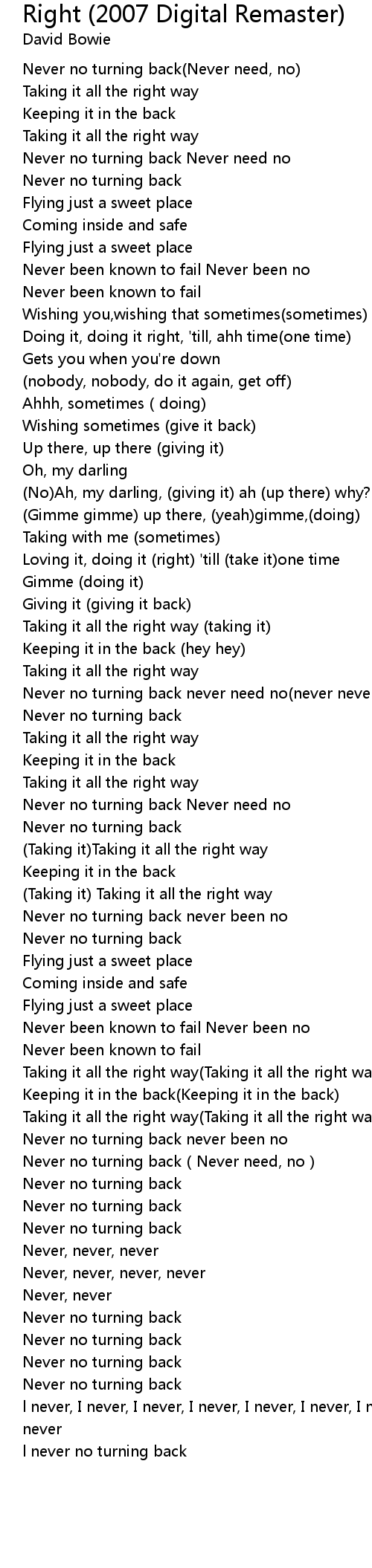 | [01:59.000] | Never no turning back never need no never never never never |