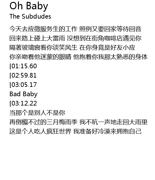 | [03:27.71][03:05.17][02:26.20][01:32.22] | nǐ zěn me kě yǐ bèi pàn de rú cǐ qīng yì Oh Bad Baby |